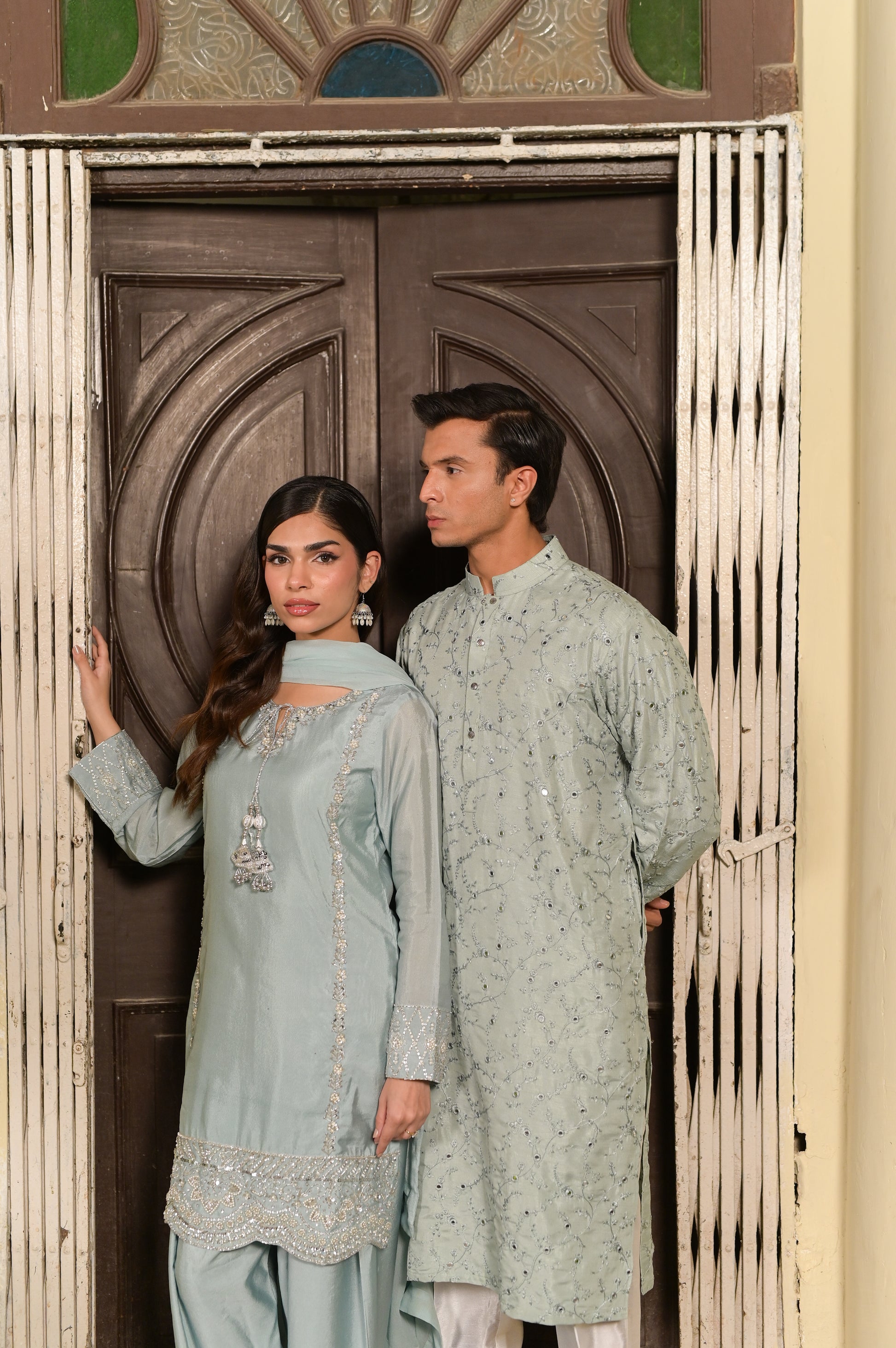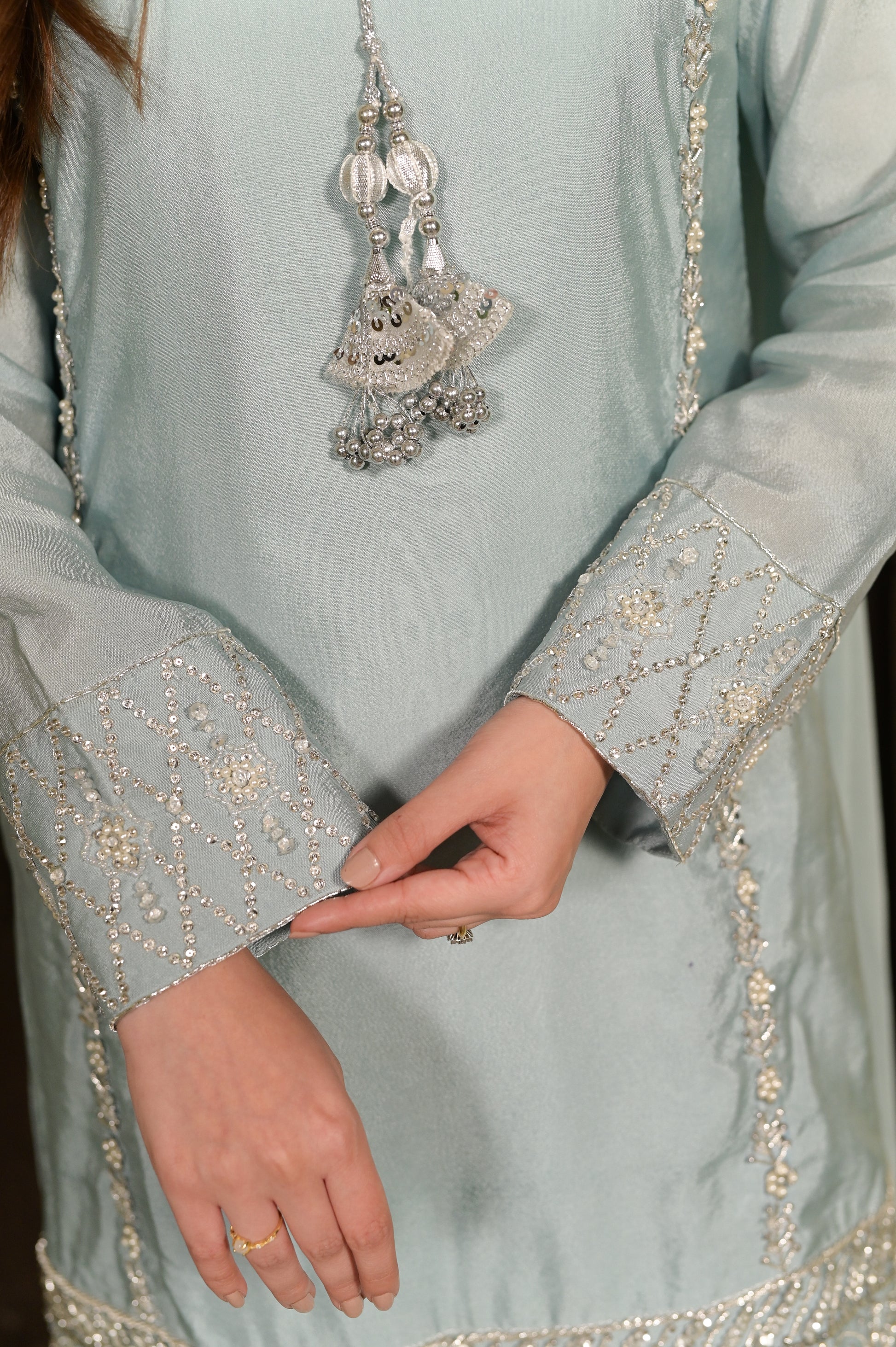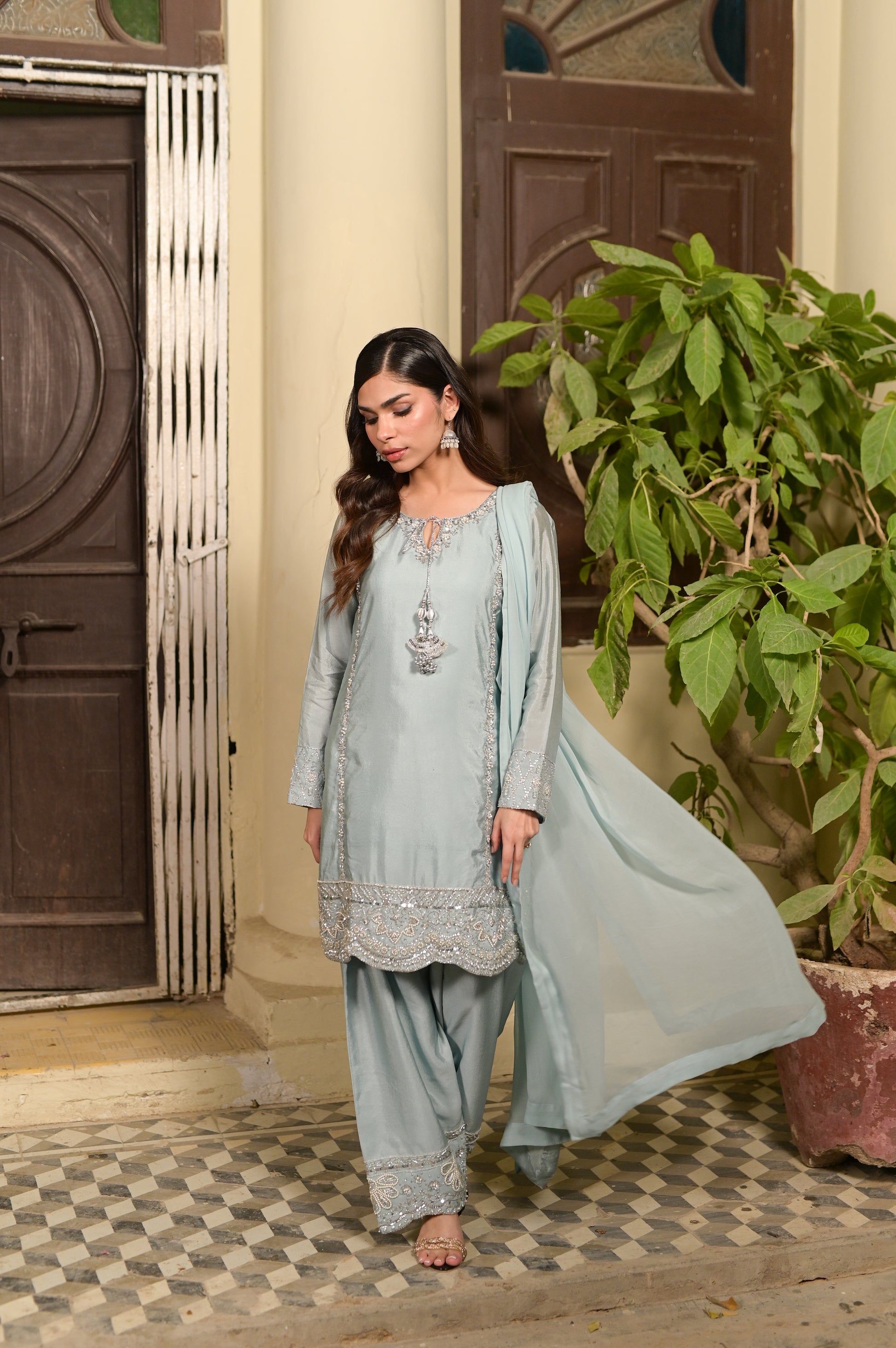 A short-shirt and shalwar ensemble in luminous Sheesha Silk. The shirt features comprehensive silver dabka, kora, and resham handwork, finished with crystals and pearls. Identical handwork is applied to the bottom of the shalwar for cohesive, celestial elegance.