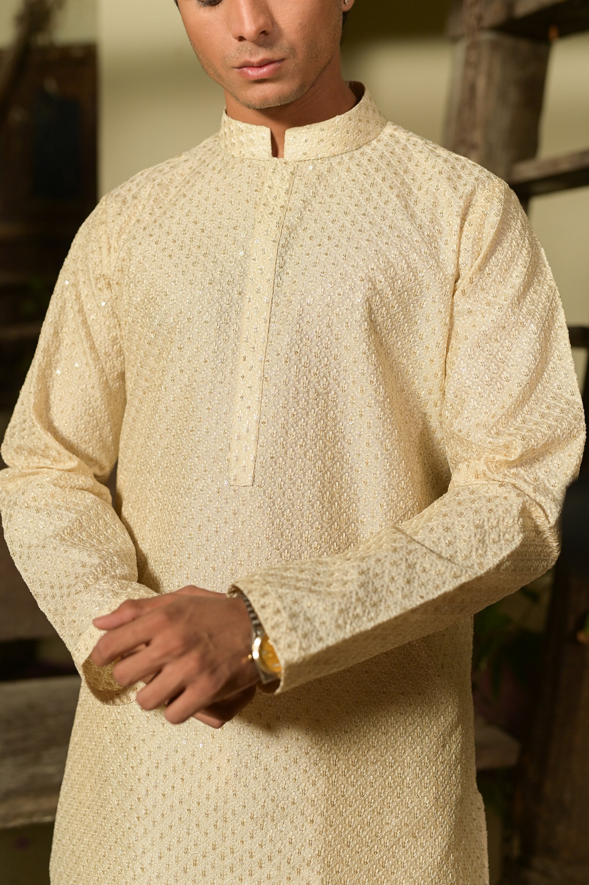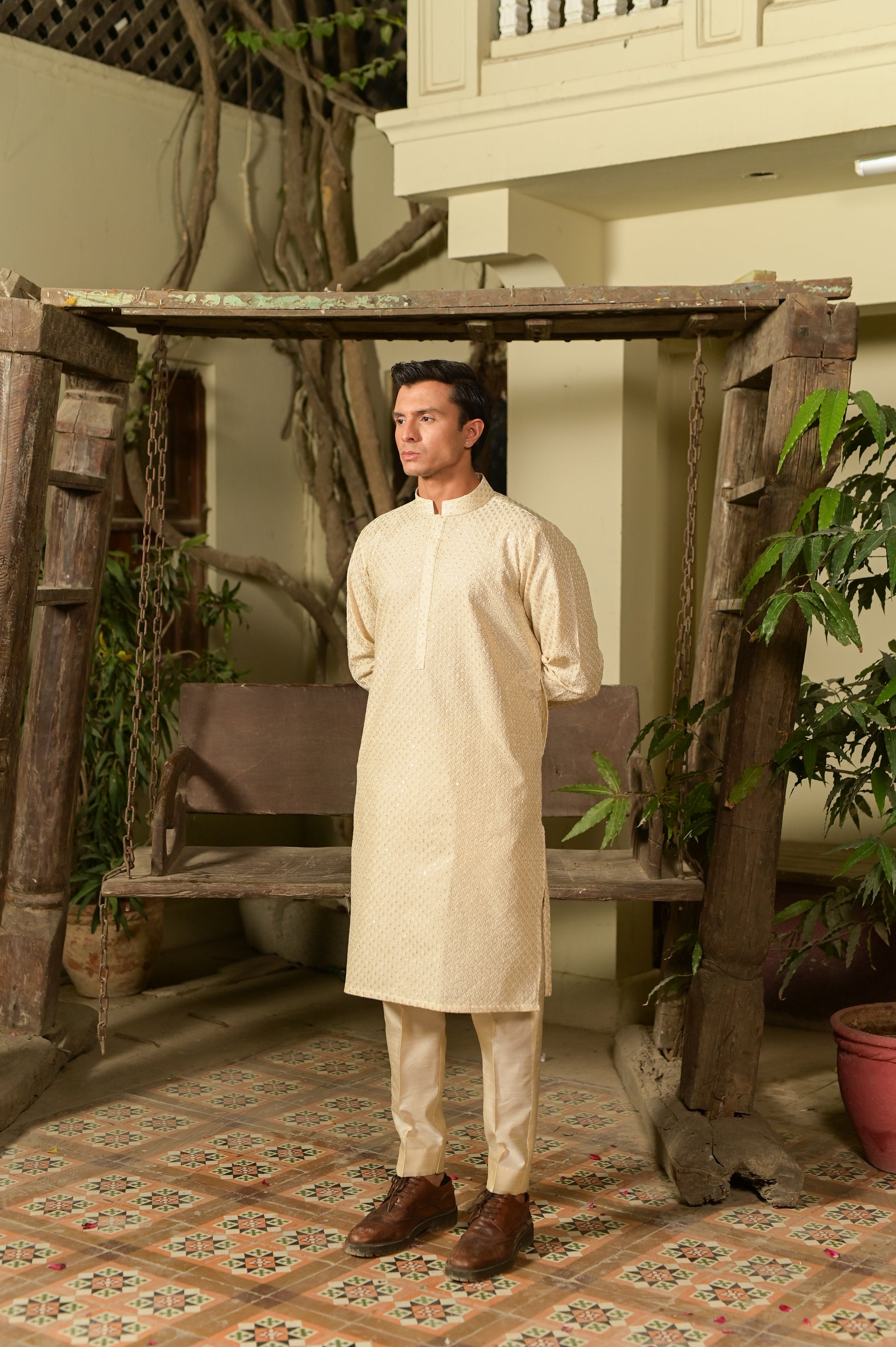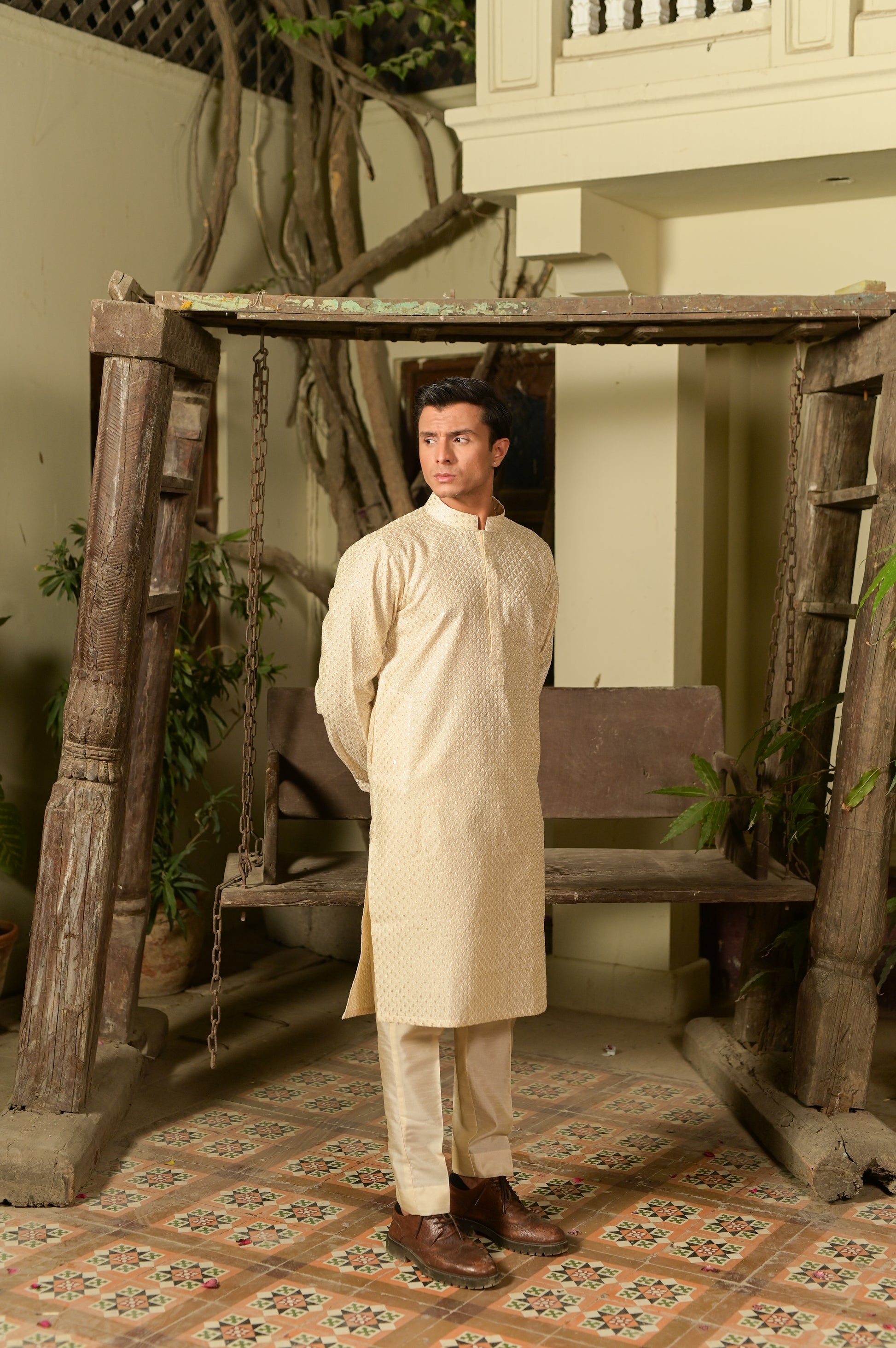 Presenting the Noor kurta set, a masterclass in refined formality. This ensemble features a cream kurta adorned with intricate all-over embroidery, offering a rich texture that captures the light. Paired with structured raw silk pants.