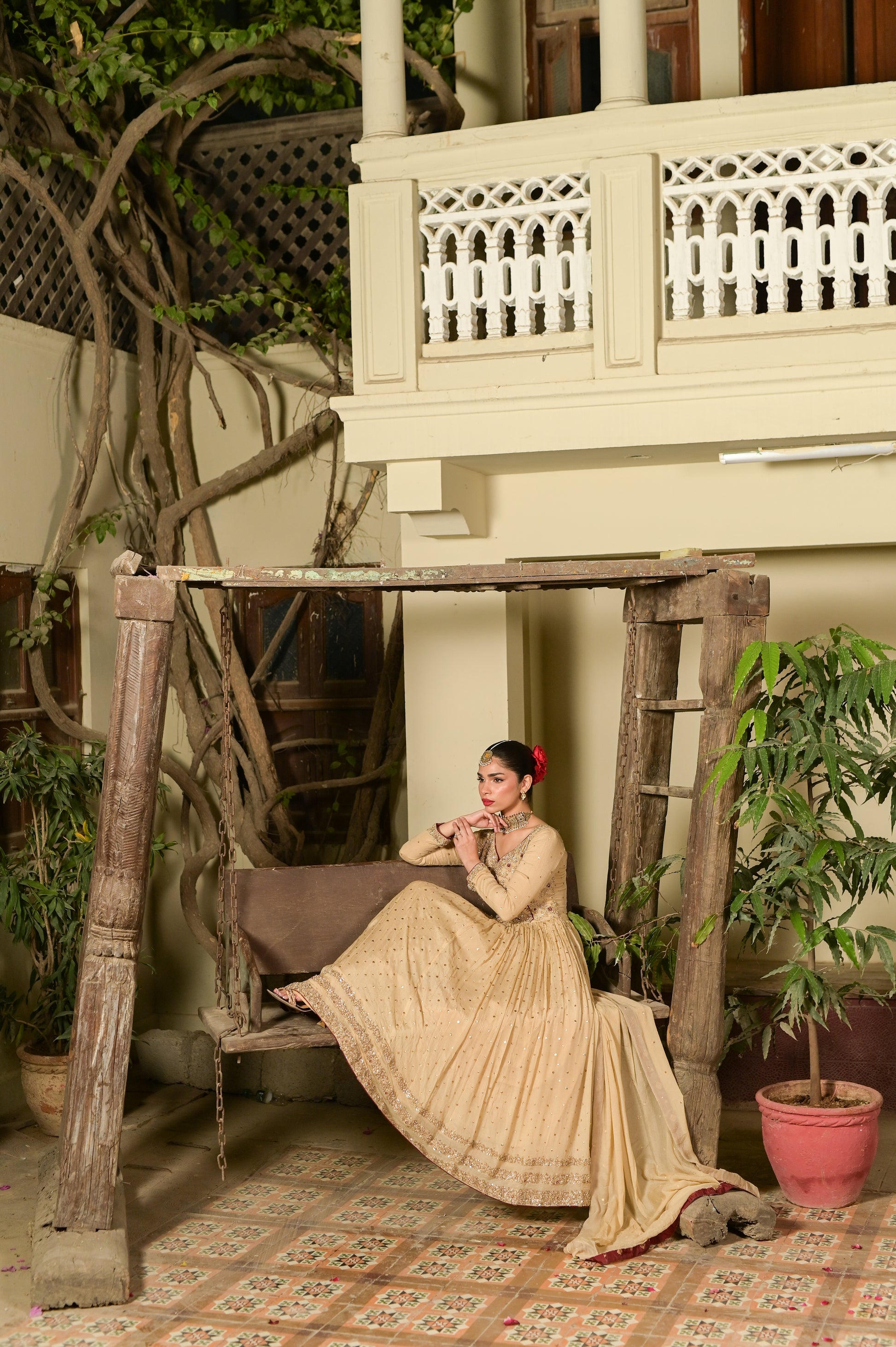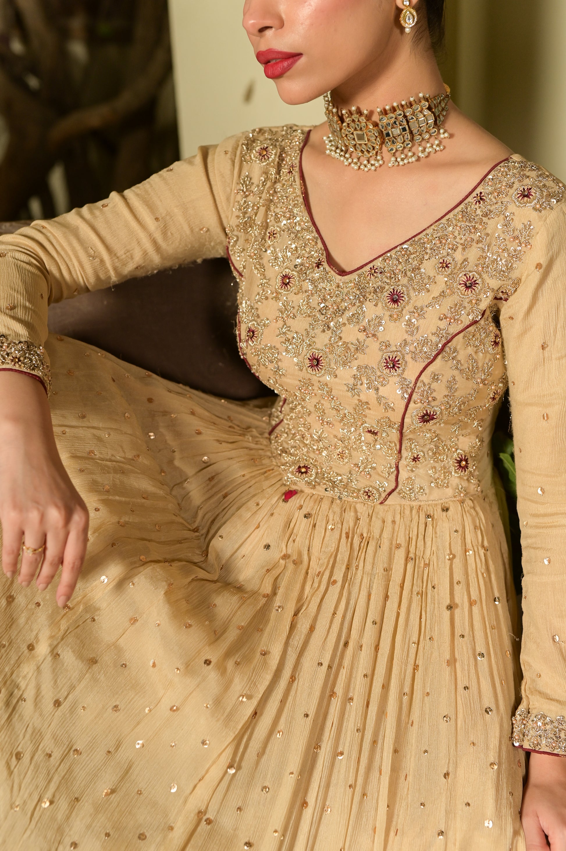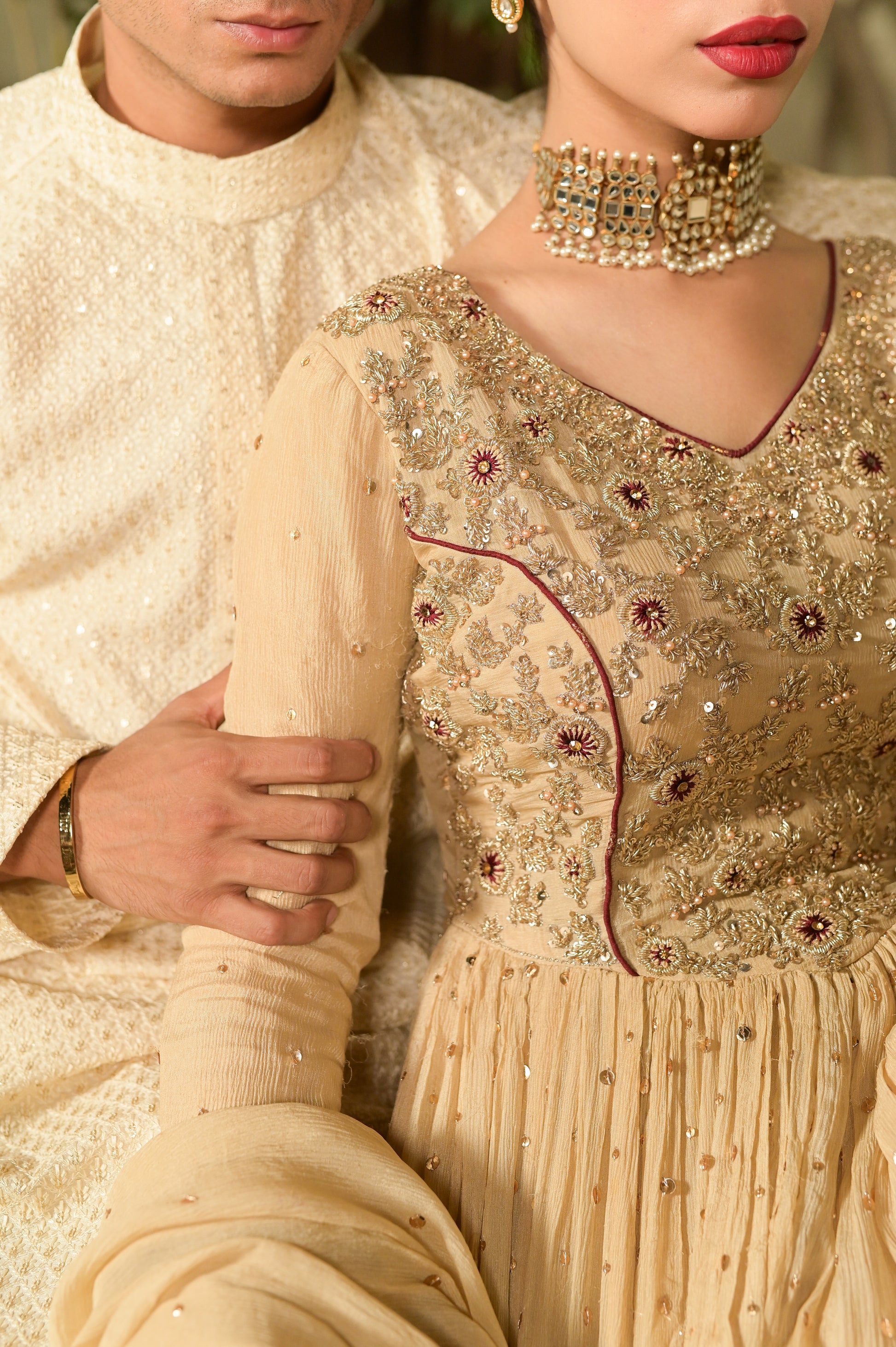 This chiffon Pishwas features artisanal hand-embroidery of luminous gold kora and deep maroon resham, richly embellished with pearls and light-catching gold sequin.