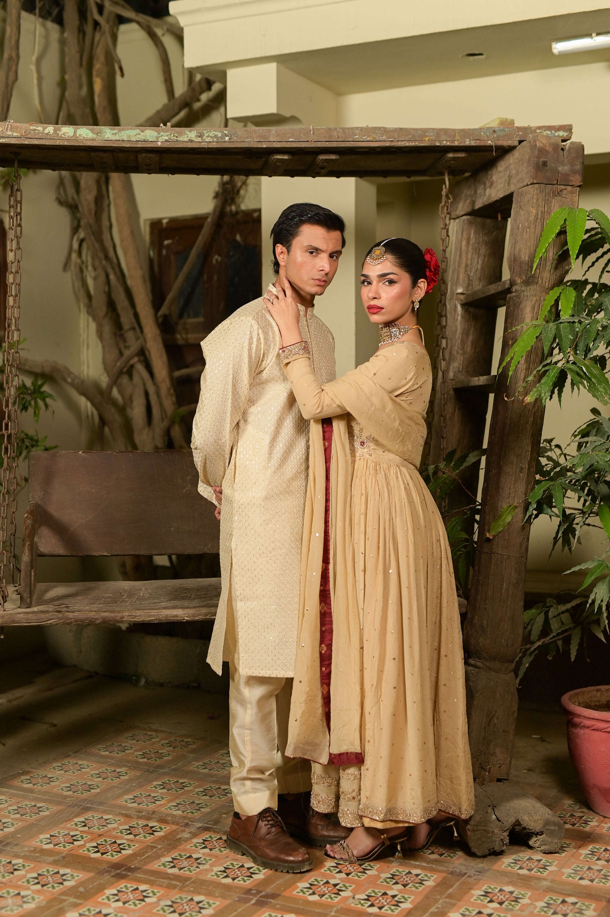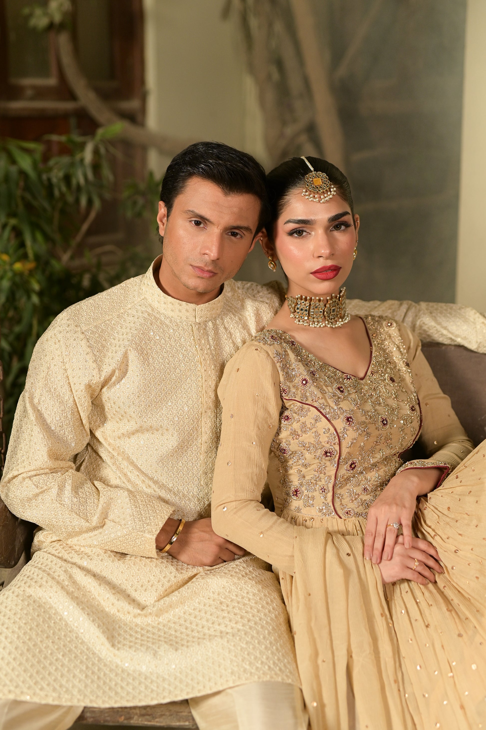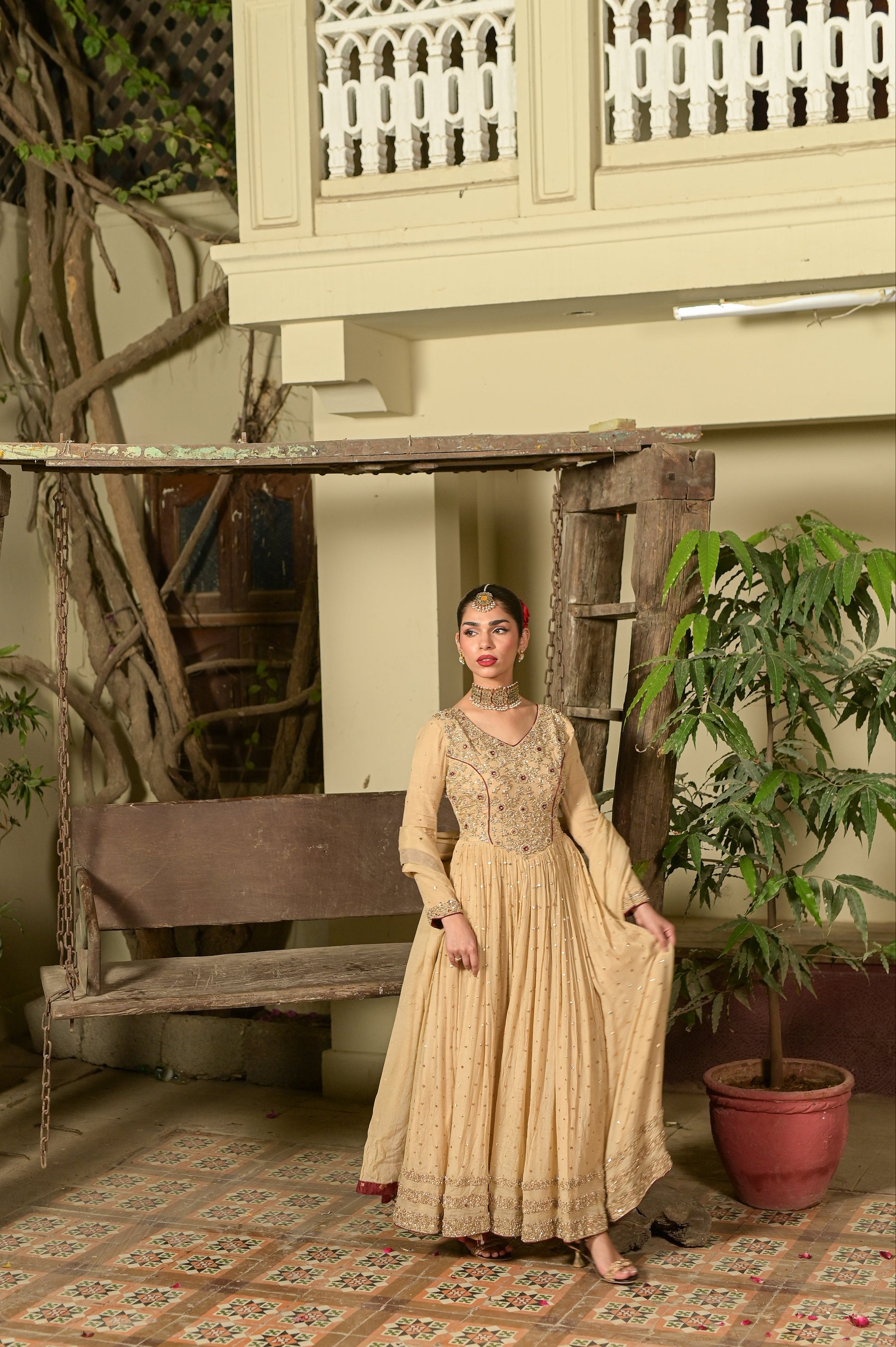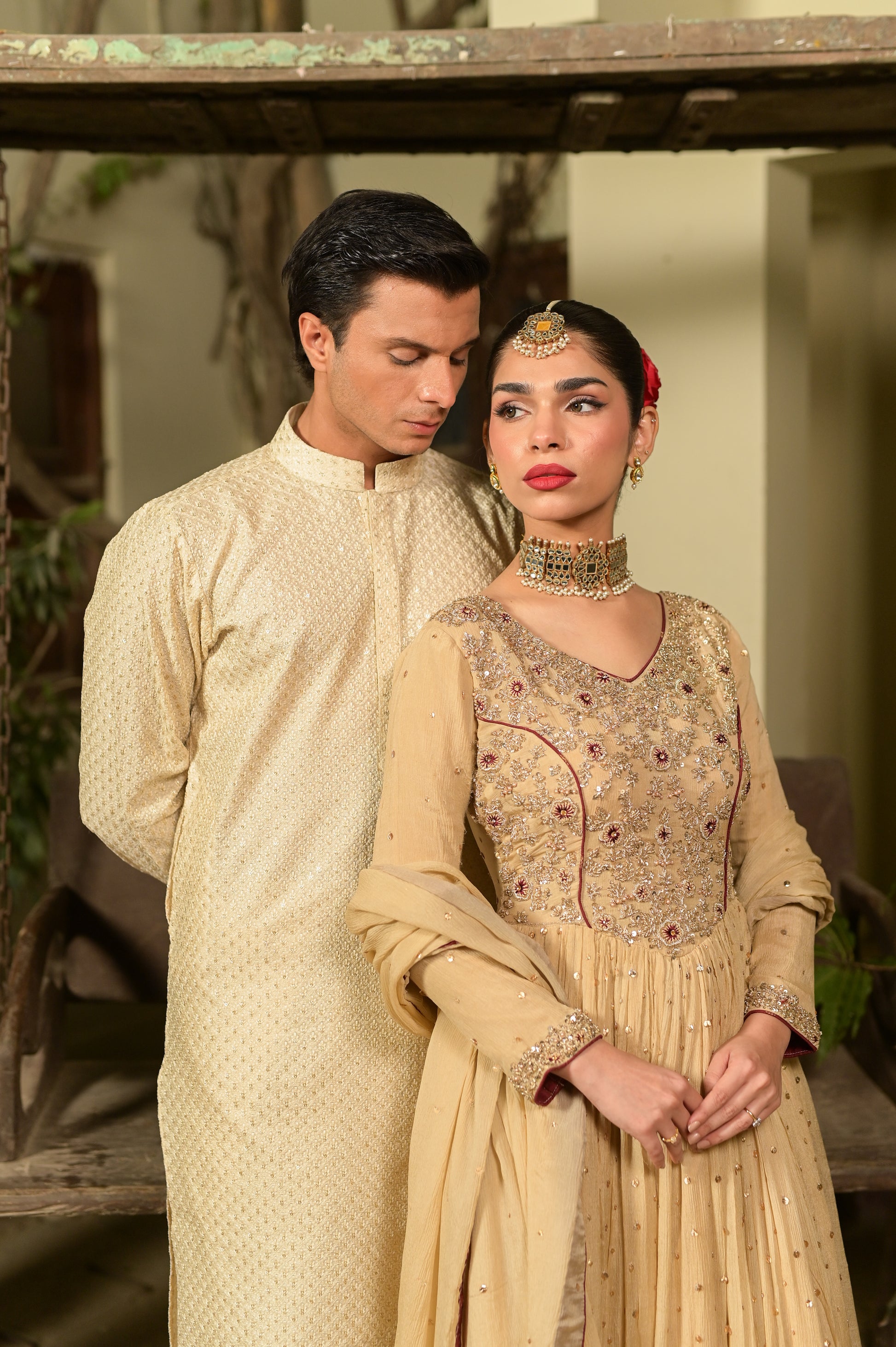 This chiffon Pishwas features artisanal hand-embroidery of luminous gold kora and deep maroon resham, richly embellished with pearls and light-catching gold sequin.