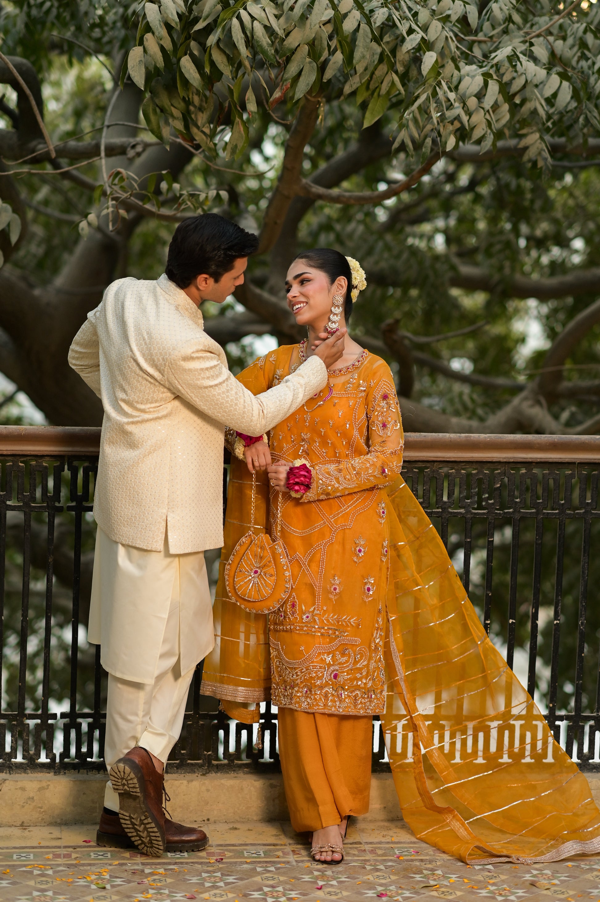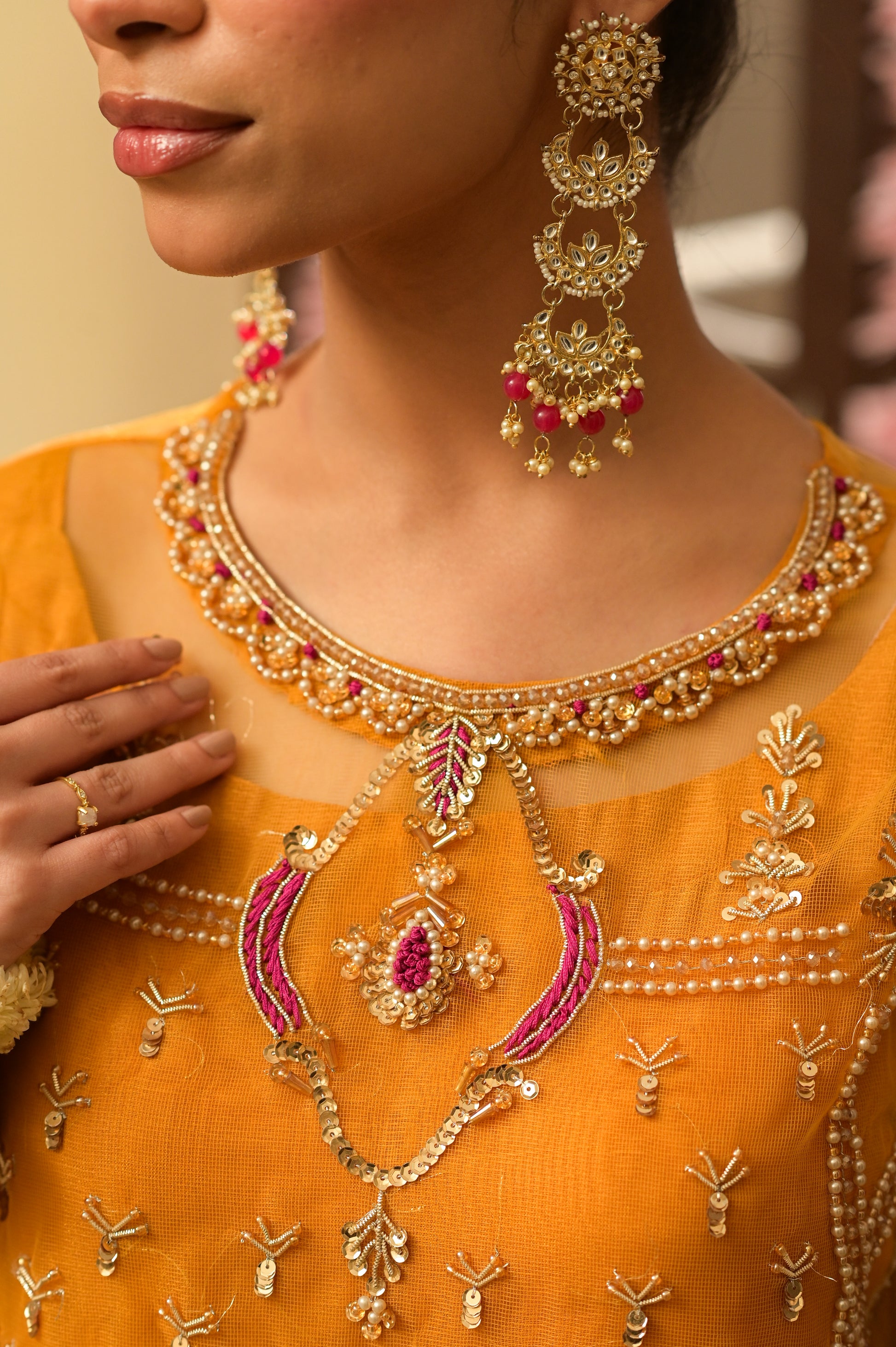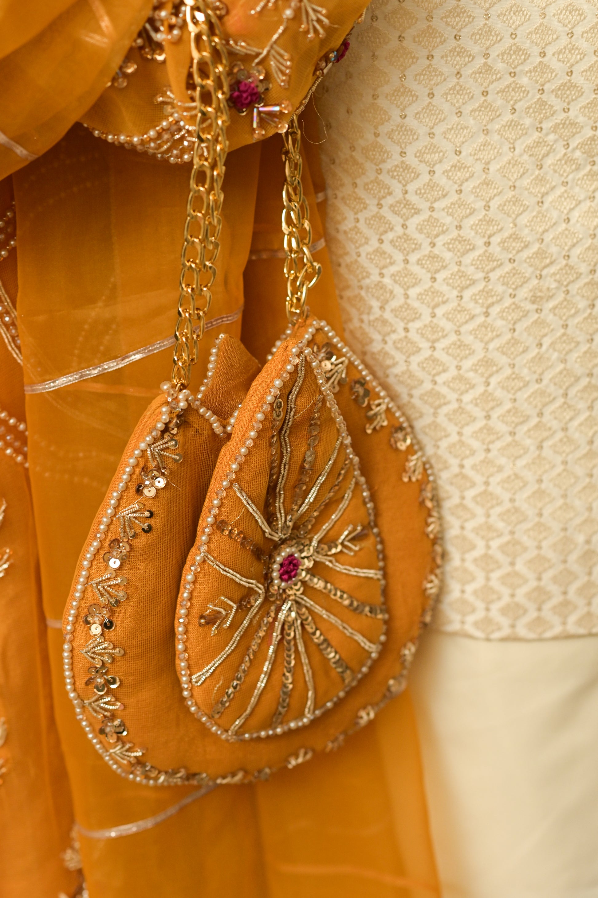 A vibrant mustard short shirt in fine net, entirely hand-worked with luminous gold dabka, resham, kora, pearls, and crystals. This festive ensemble includes a beautifully matched Polti bag and a pure Organza dupatta.